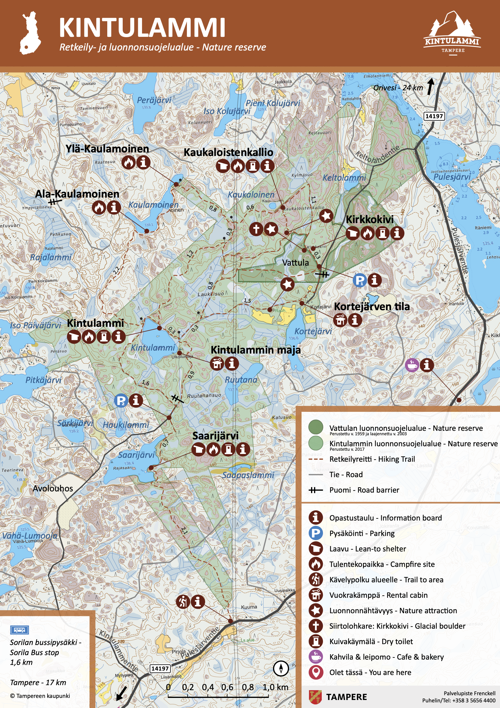 Opastettuja retkeilyreittejä noin 18 km useina rengasreitteinä. Kirkkokivelle johtaa 300 m esteetön polku. Viisi laavua (Kirkkokivi, Kintulammi, Kaukaloistenkallio, Saarijärvi, Ala-Kaulamoinen) ja kaksi tulipaikkaa ilman laavua. Vuokrattavissa Kintulammin maja ja Kortejärven tila. Kävijämäärä ylitti 51 000 vuonna 2020. Suunnitteilla retkeilyreitti Oriveden keskustaan ja yhteys Kangasalan Kaarinanpolkuun.