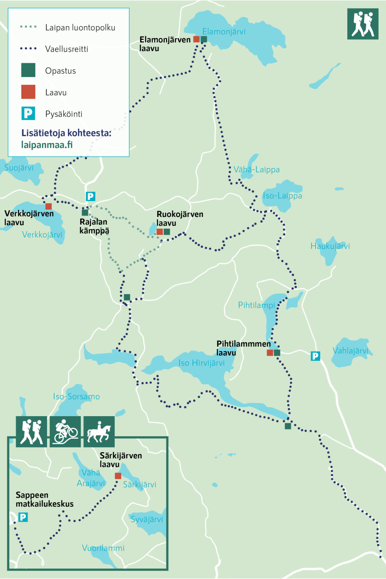 Opastettuja polkuja on noin 30 km, kaikki merkitty maastoon sinisillä opastetolpilla. Hirvijärven kierros (12 km, vaativa) on alueen pisin rengasreitti suurine korkeuseroineen ja kalliomaisemineen — Korppivuoren jyrkät kalliot ja Tulivuoren sammaleiset nousut ovat reitin kohokohtia. Rajalan luontopolku (3 km, helppo) sopii lapsiperheille ja kulkee vanhan metsän halki Ruokojärvelle, jonka rantaan majavat ovat asettuneet. Reitin varrella on 1800-luvun eläinsuojan kivirauniot. Lyhyempiä reittejä ovat Haltian reitti ja Sappee-reitti, joka yhdistää alueen Sappeen matkailukeskukseen.